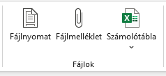 A Fájlok csoportban három parancsot találunk; a Fájlnyomatot, a Fájlmellékletet és a Számolótáblát, melyről később lesz szó. Jogos kérdés, hogy mi a különbség a fájlnyomat és a fájlmelléklet között, hiszen a rákattintáskor mind a kettő parancs egy fájlválasztó ablakot fog feldobni. A különbség a szerkeszthetőségben van. Míg a fájlmelléklet a konkrét fájlt csatolja be, addig a fájlnyomat csak egy képet készít a fájlunkról és azt csatolja be, így ennek megfelelően nem szerkeszthető a tartalma.