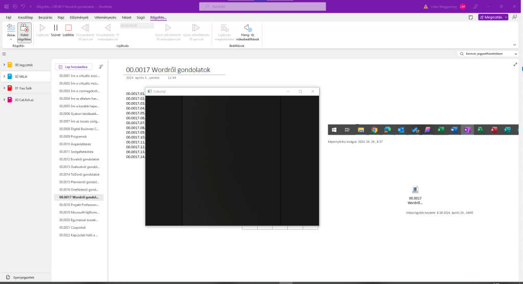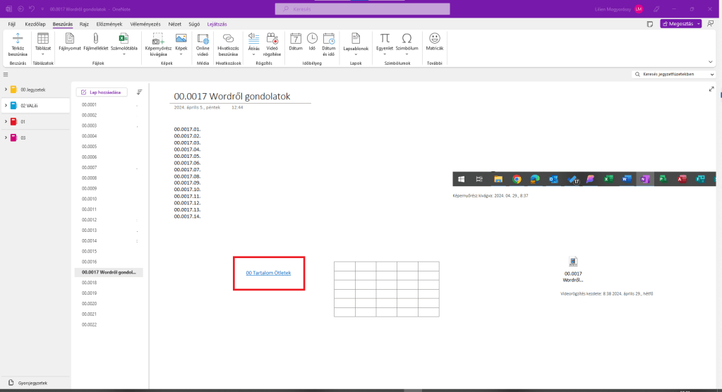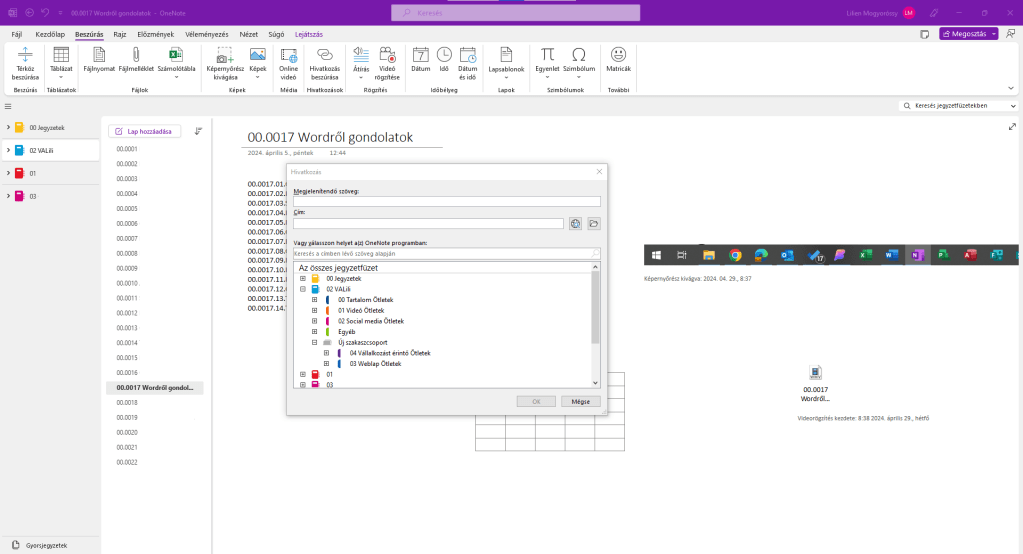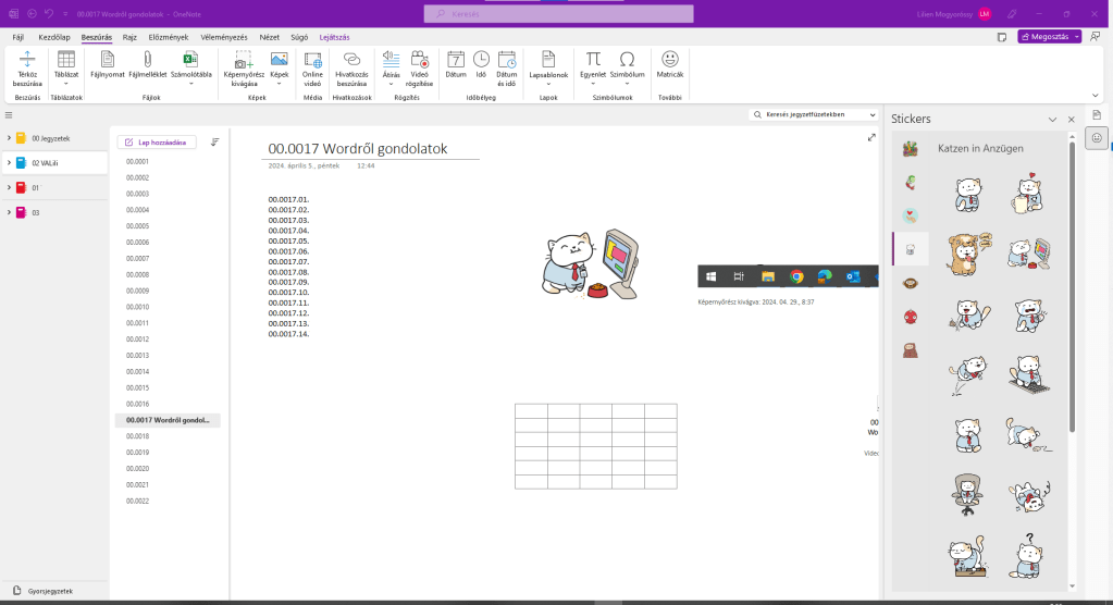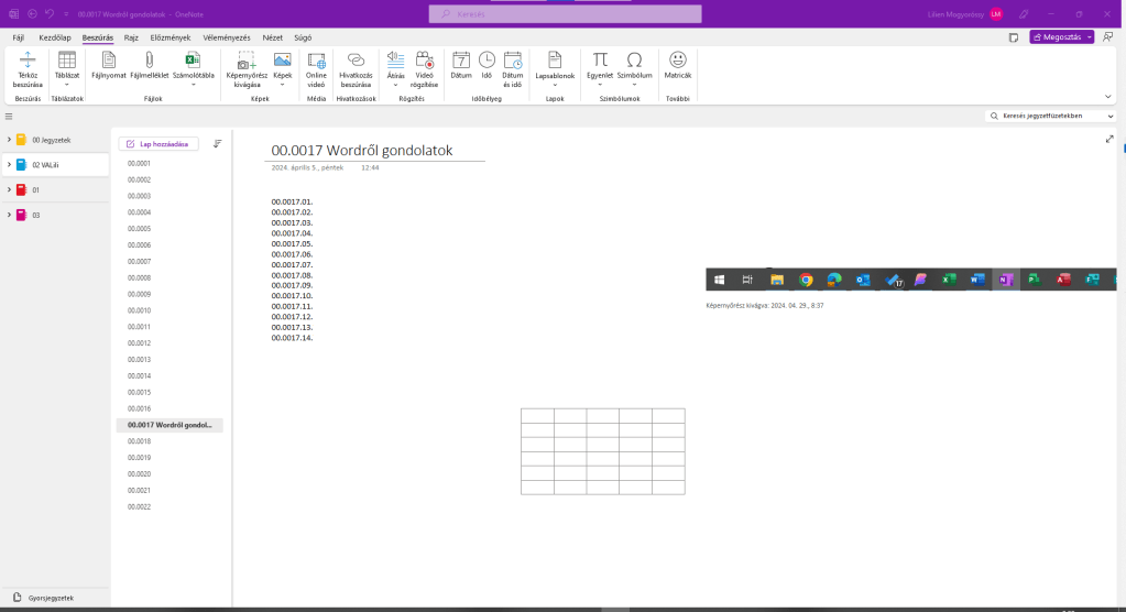 A Képek csoportban találjuk a Képernyőrés kivágása parancsot és a Képek menüt. Előbbire rányomva a OneNote tálcára kerül, a képernyő elszürkül és a kurzor „+” alakot vesz fel. A bal egérgombot lenyomva és az egeret húzva kijelölhetünk egy képernyőrészt és ha a gombot felengedjük, akkor a OneNote felülete visszatér, rajta a korábban kijelölt képernyőrésszel, mely innét kezdve képként kezelhető. Ezen kívül még azt is megkapjuk, hogy maga a képernyőkép pontosan mikor készült. Én most ennek bemutatására a tálcármról készítettem egy képernyőképet: