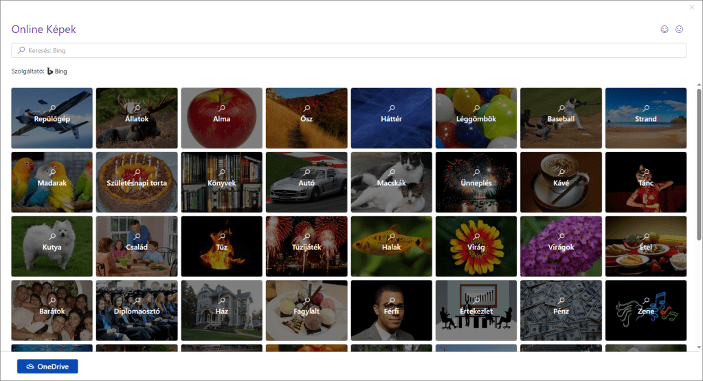 A képek menüben három opciónk van a képek beszúrására; vagy fájlból, vagy webről vagy szúrunk be, illetve lehetőség van a webkameránk képének beszúrására. Amennyiben webről szeretnénk képet beszúrni, egy nagy felugró ablakban választhatunk, hogy a Bing picture library-ból, vagy a OneDrive-unkból szeretnénk-e ezt megtenni.