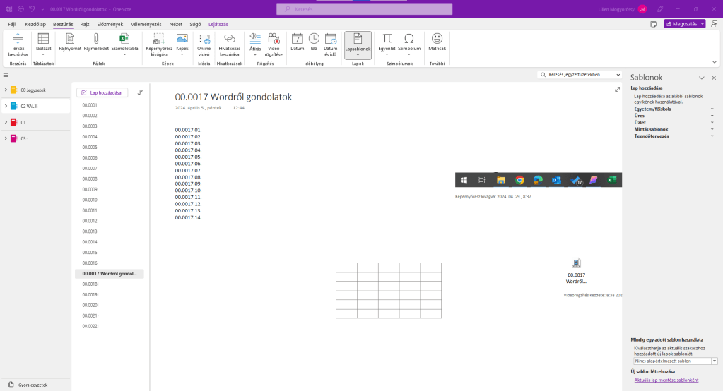 A Lapok csoportban a Lapsablonok menüt találjuk. Erre kattintva egy oldalsó menü jelenik meg, ahol különböző, előre definiált sablonokat illeszthetünk be, hogy arra folytassuk a jegyzetelést.