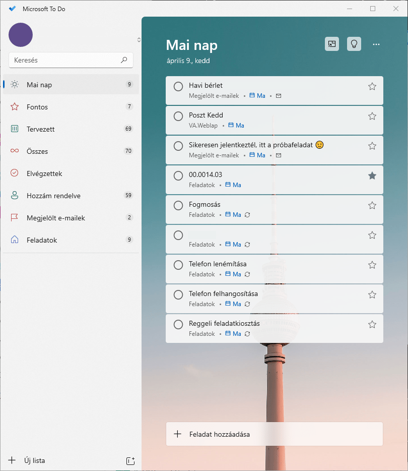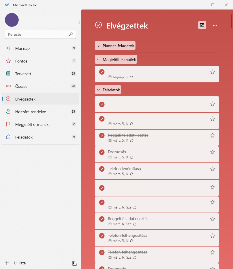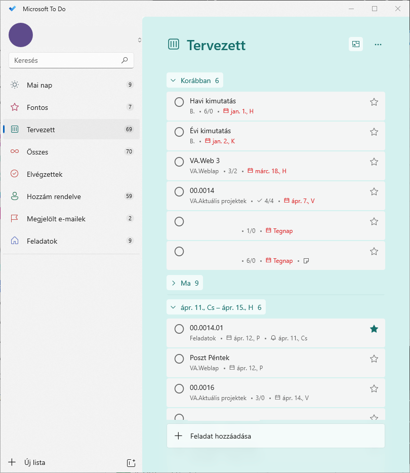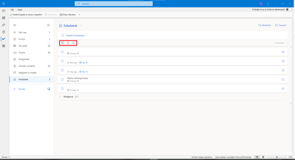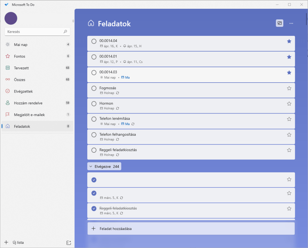 Az első kategória utolsó nézete a „Feladatok”, egyben ez az egyetlen, ami ténylegesen tárolja is a feladatainkat. Az előzőekkel ellentétben nem csak valamilyen elv mentén megjeleníti vagy egy másik programból érkező feladat másolatát tartalmazza, hanem ide kerülnek azok a feladatok, melyeket a ToDo-ban írunk be. Rendezését tekintve is eltér a többitől, mert itt felül az elvégzendő feladatok, alatta pedig az elvégzett feladatok találhatók. Természetesen ez a nézet is átrendezhető.