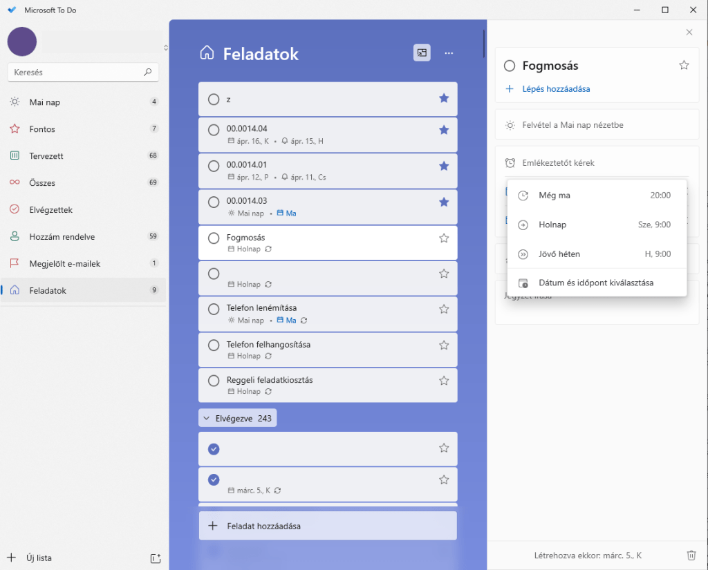 Egy gyors gomb is található a programban arra az esetre, ha sok tevékenységet írtunk be egyszerre valamelyik listára és nem szeretnénk egyesével állítgatni a mai dátumokat, akkor a jobb oldali sávban egyetlen kattintással elintézhető ez. Ha egy olyan feladatra kattintunk, melyet már korábban hozzáadtunk a listánkhoz és nem a mai nap a határideje, akkor a jobb oldali sávban, a cím és a lépések hozzáadása alatt található „Felvétel a Mai nap nézetbe” gombbal tehetjük meg.