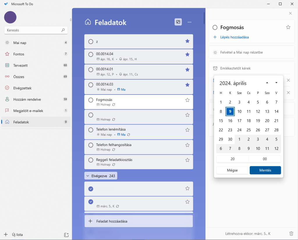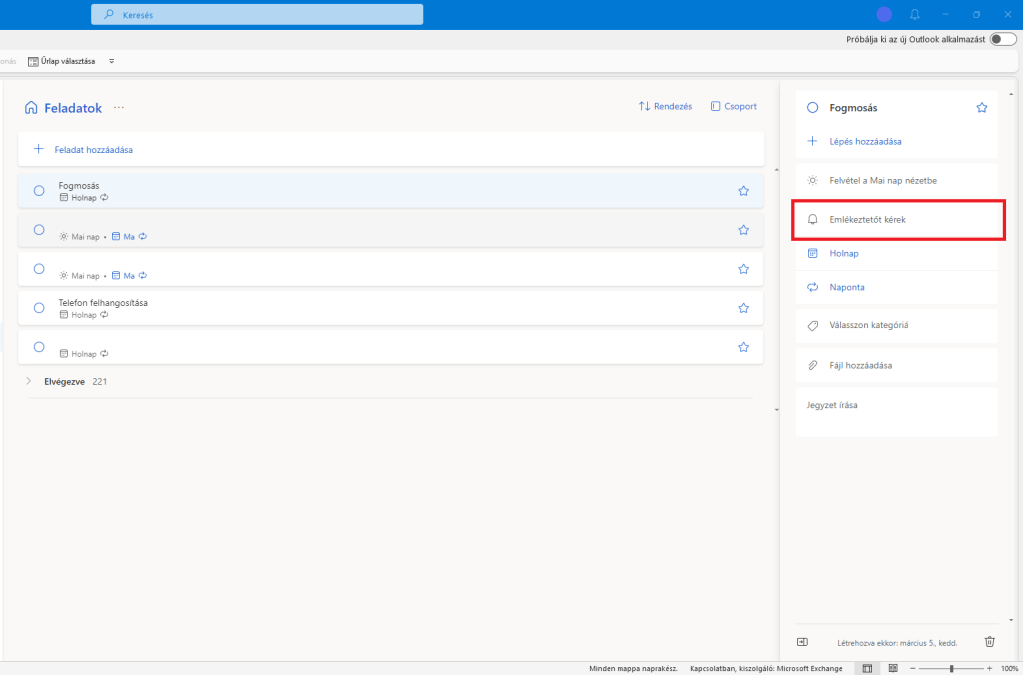Talán magától értetődő, de a feladatokhoz hiába lehet itt maximum 20 db lépést hozzátenni, azokra nem állíthatók külön dátumok. A középső sáv és a jobb oldali sáv naptár ikonjának segítségével, illetve a korábban említett gyorsgombbal csak a feladat dátumát lehet állítani. Ugyanez érvényes az emlékeztetőre és az ismétlésre, melyek szintén a jobb oldalon állíthatók be.