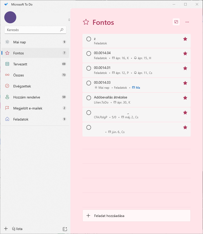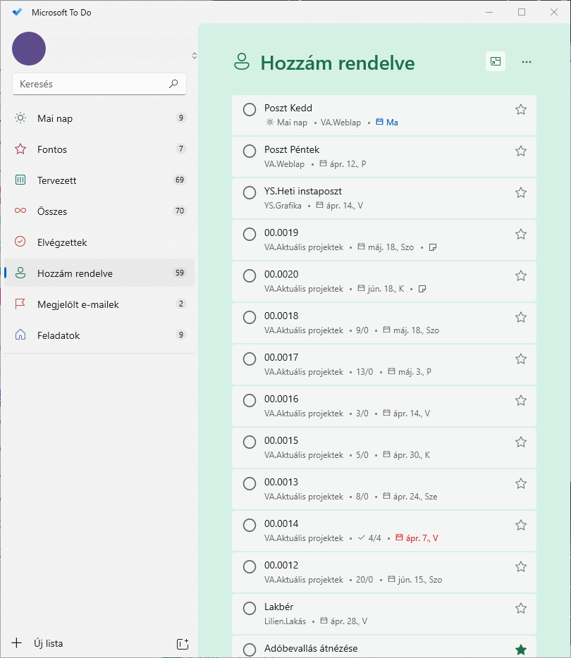 A következő nézet a „Fontos”. Ez egy nagyon egyszerű nézet, gyakorlatilag ez sem tárol feladatokat, csak megjelenít. Azok a feladatok kerülnek ide, amiknél a jobb oldali sávban a feladat neve mellett megnyomtuk a kis csillagot.