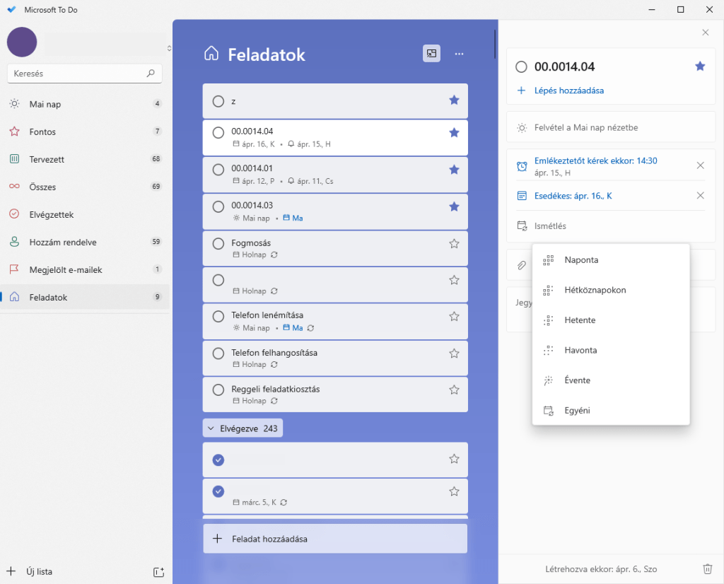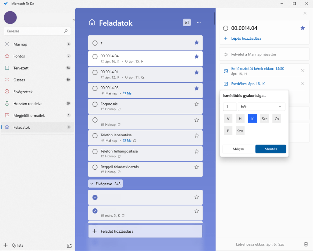 Az ismétlés már egy hajszálnyival bonyolultabb. Az eddig említettekre kattintva nagyon hasonló felületet Itt lehetőség van arra, hogy kiválaszthassuk a gyakoriságot napok szerint. Ha a „Naponta” lehetőséget választjuk, akkor minden nap megjelenik az adott feladat a „Mai nap” nézetben. Ha a felületen a „hét”-re állítjuk be a jobb oldali értéket, akkor meghatározhatjuk, hogy a héten mely napokon jelenjen meg a tevékenységünk a „Mai nap”-ban.
