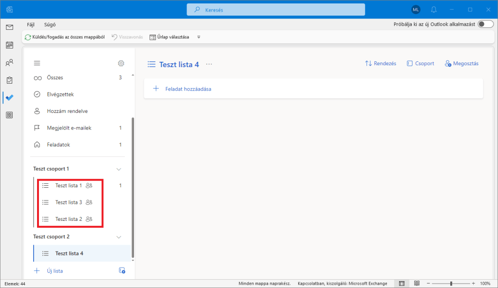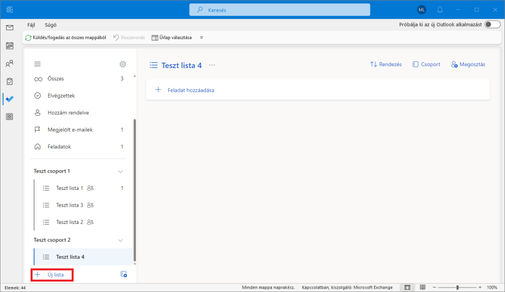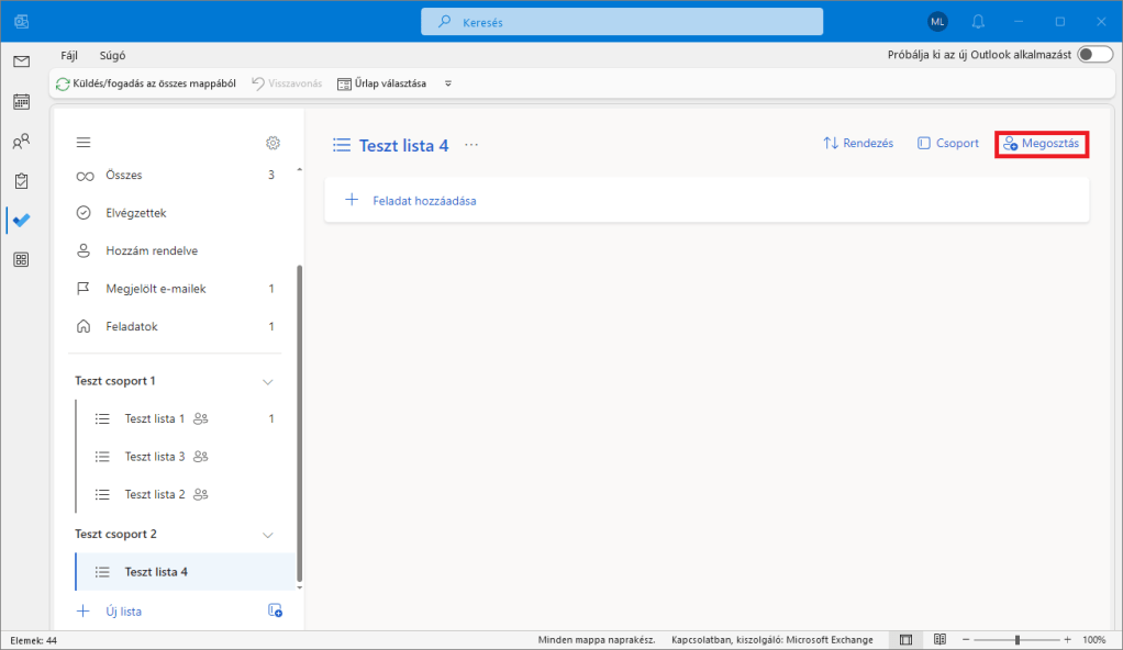 Új lista létrehozását a bal oldali sávban a „+ Új lista” nevű gombbal tehetjük meg. Ennek megnyomása után el kell azt nevezni és már kész is. A feladatokat beírhatjuk itt, vagy egy másik nézetből húzással helyezhetjük el itt. Ez két dologra jó; túlbonyolíthatjuk bele az életünket, vagy használhatjuk csapatmunkákhoz. Ugyanis az általunk hozzáadott lista pont olyan, mint a „feladatok” nézet, azzal a kis plusszal, hogy van egy „Megosztás” gomb a középső sáv jobb felső részén. Ezzel elküldhetünk egy kérelmet egy ismerősünknek, munkatársunknak, vagy egy másik e-mail címünknek, hogy csatlakozzon a listánkhoz. Ilyenkor az illetőnek el kell ezt fogadni, majd újra bejelentkeznie és a megosztott lista mellett megjelenik egy kis ikon.