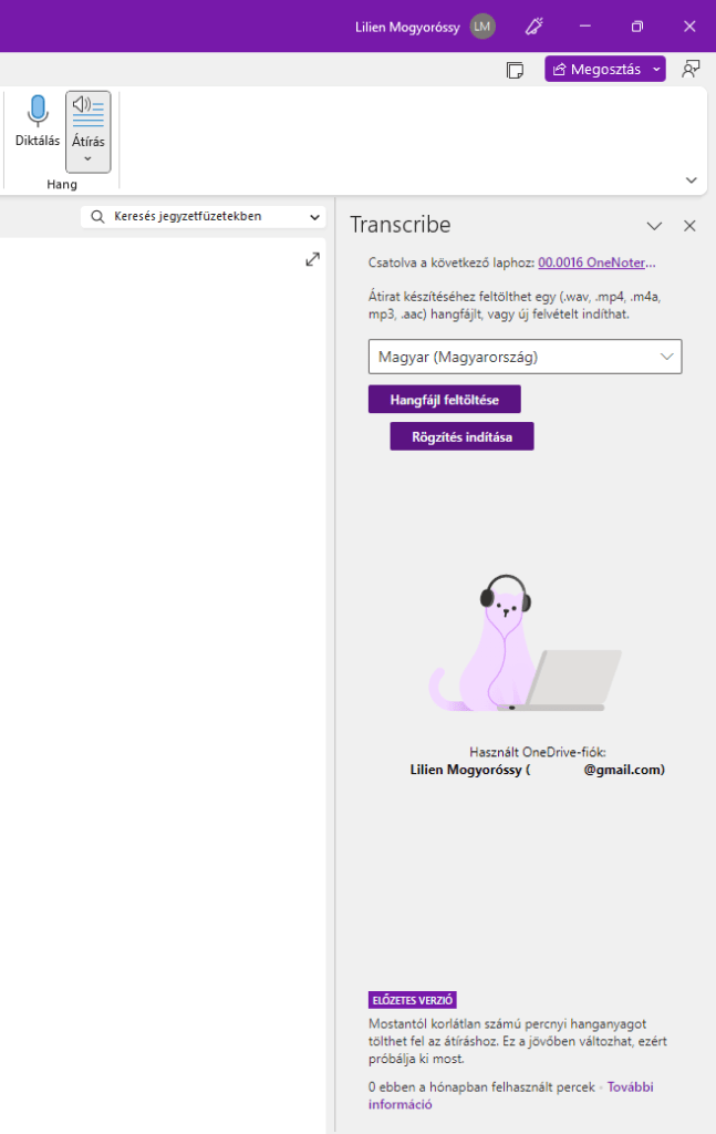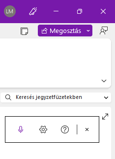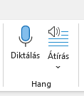 Utolsóként a Hang csoportot találjuk. Itt hang alapú szövegbevitelre és annak módosítására van lehetőség, mely tökéletes azoknak, akik szeretnek vagy kénytelenek hanggal generálni jegyzeteket. A Diktálás parancs esetén egy kis menü jelenik meg a jegyzet felület jobb felső sarkánál, melyek a felvétel indítását, szüneteltetését, leállítását és beállításait végezhetjük el. Az Átírás parancs esetén pedig egy kisebb menü ugrik fel a jobb oldalon, ahol a OneDrive-unkról feltöltött hangfájlokat módosíthatjuk.