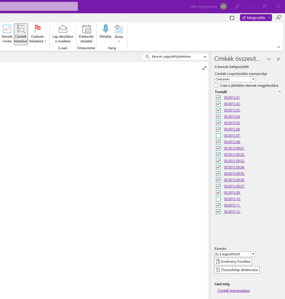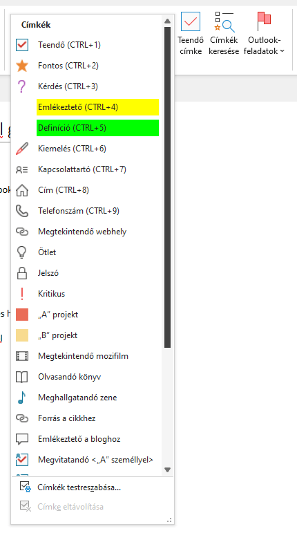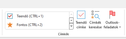 Ebben a csoportban további két parancsot találunk. Az „Outlook feladatok” paranccsal a későbbiekben fogunk foglalkozni. A „Címkék keresése” parancs egy menüt hoz fel az ablak jobb oldalán. Itt a már elhelyezett címkék között lehet navigálni különböző szempontok szerint.