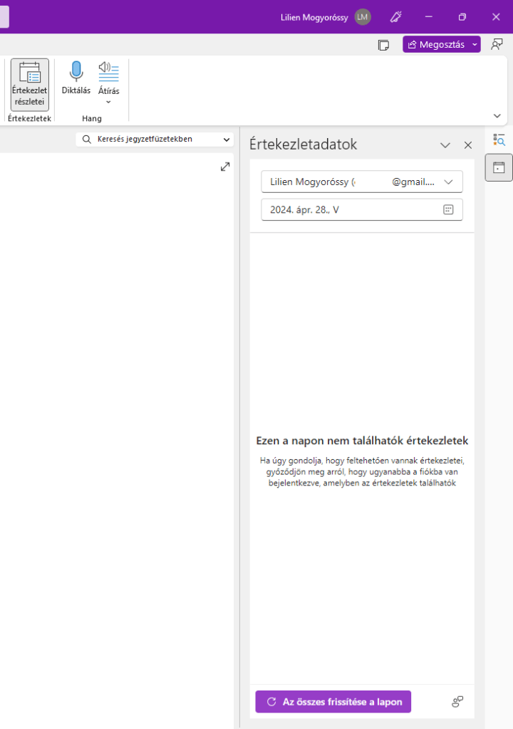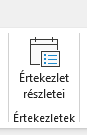 Az Értekezletek csoport szintén egyetlen parancsot tartalmaz, melyre nyomva előjön egy jobb oldali menü. Itt lehet látni az értekezleteket, melyeket az Outlookban vagy más Microsoft programban összeállítottunk vagy összeállította valamely velünk kapcsolatban álló személy.