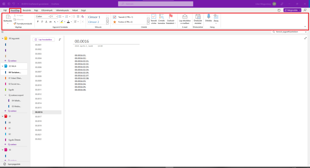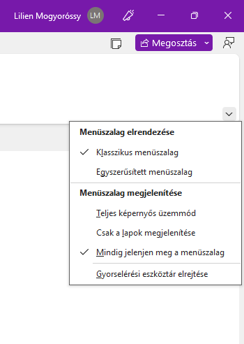 A OneNote menüszalagján, a program megnyitásakor a „Kezdőlap” menü fogad minket. Ennek jobb szélén találunk egy kis lefelé mutató nyilat, mely egy nézetválasztó menüt rejt magában, ahol beállíthatjuk a nekünk megfelelő nézetet. Én most az egyszerűség kedvéért a következő beállításokat fogom használni: