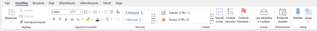 Ahogy már megszokhattuk a Microsoft Office hétköznapokban gyakran előforduló programjaival kapcsolatban, a menüszalag teljes mértékben testreszabható, akár minden menüt eltüntethetünk, hogy az általunk preferált módon építsük azt újra. Viszont most még nem a varázslatok birodalmával fogunk foglalkozni, hanem az egyszerű alapértelmezett menüszalaggal. Ez csoportokra tagolódik, melyeknek egymástól függőleges vonallal vannak elválasztva és alul középen található a nevük. Balról jobbra a következők; Vágólap, Egyszerű formázás, stílusok, Címkék, E-mail, Értekezletek, Hang.