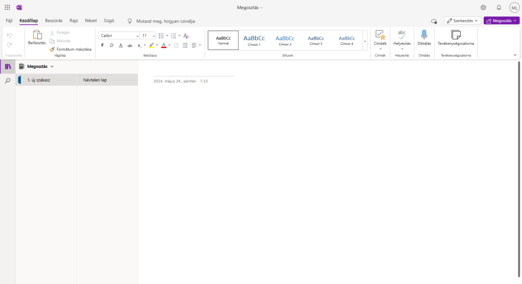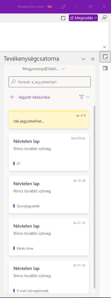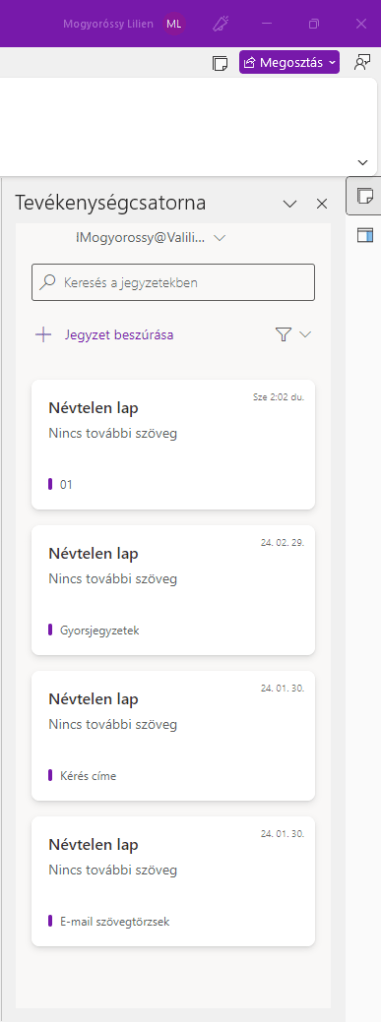 Nálam csak üres lapok vannak, de itt jelenik meg minden, amit a másik e-mail cím tulajdonosa csinál a jegyzetfüzetein belül. Az itt megjelenő lapokra kattintva azonnal hozzáférést kapunk a másik jegyzetfüzetéhez, és az bekerül a bal oldali sávunkba is. (Ezt a nevet én adtam a jegyzetfüzetnek, nem automatikusan generálta ilyenre)