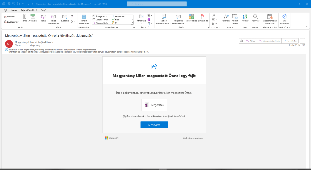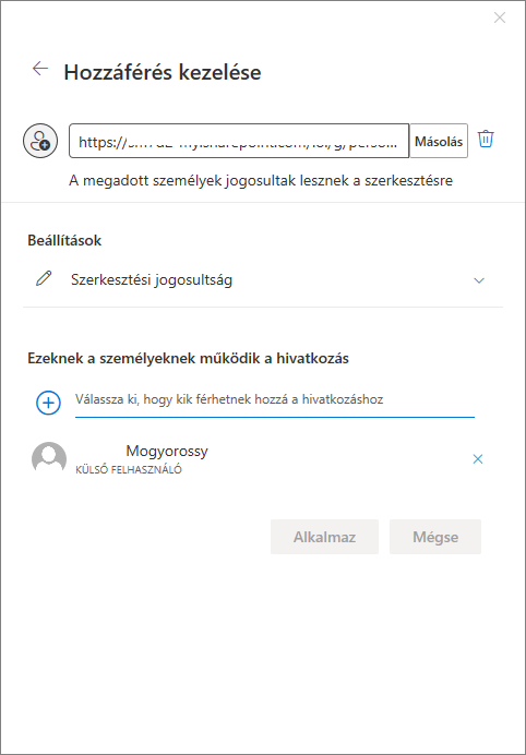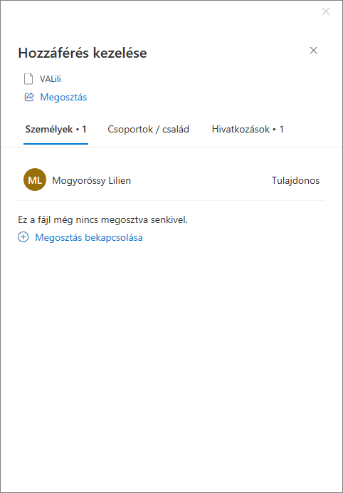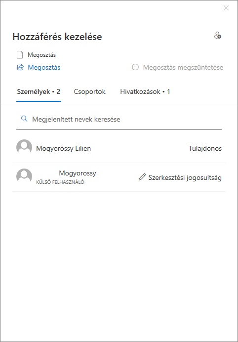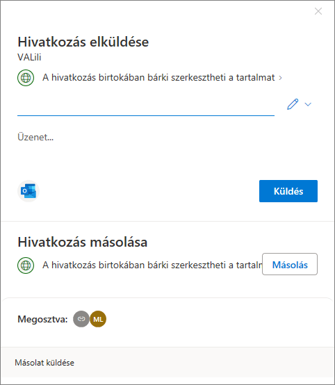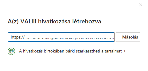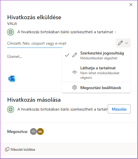 Ez lényegét tekintve nem tér el az előzőtől, ugyanúgy megtalálható benne a jogosultság beállítása, a hivatkozás másolásának lehetősége és azt is látjuk, hány emberrel lett eddig megosztva.