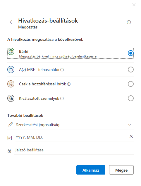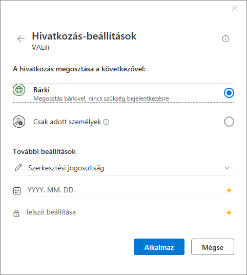A megosztási beállítások kissé eltérőek az előzőhöz képest, mert itt csak azt állíthatjuk be, hogy bárki, vagy kizárólag az adott személy férjen hozzá.