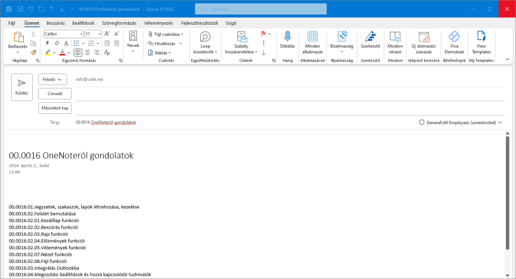 Megosztani persze nem csak a komplett jegyzetfüzetet lehet. Annak tartalmát is elküldhetjük valakinek. Erre szolgál a Másolat küldése parancs a korábbi ablak alján, melynek hatására egy Outlook-os ablak nyílik meg egy sablon e-mail-el, amiben az aktuális lap információi kapnak helyet.
