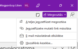 Ha a Fájl -> Megosztásra nyomunk ezek után, akkor ugyanez a menü fogad minket, viszont, ha nem ezt a jegyzetfüzetet kívánjuk a továbbiakban is megosztani, hanem egy olyanra térünk át, melyet még nem osztottunk meg korábban, akkor kissé módosul az ablak. Azt persze figyelembe kell venni, hogy a Gyorsjegyzeteket ezen a menün keresztül nem lehet megosztani.
