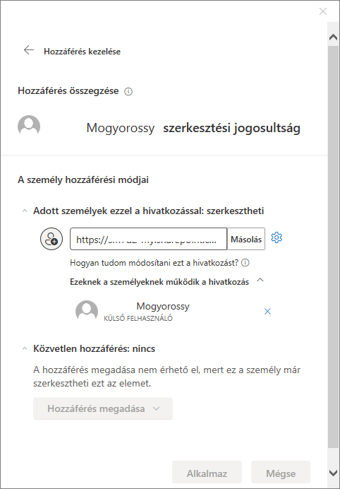 Természetesen akkor néz ki így, ha mindent lenyitunk, amit csak lehet. A példában látható, hogy a Közvetlen hozzáférés nem módosítható, az ott írt okokból kifolyólag. Ha ezen változtatni akarunk, akkor a kis fogaskerék ikonra kell nyomni és bejön egy újabb ablak, ahol ezt megtehetjük. Sőt itt hozzáadhatunk és kivehetünk személyeket a megosztásból.