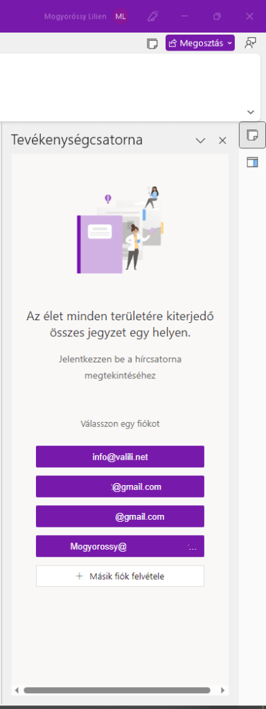 Rányomva a menüre, ezt az oldalsávot kapjuk. Itt kiválaszthatjuk, hogy melyik e-mail címhez kapcsolódó tevékenységekről szeretnénk tudomást szerezni. Választhatunk a listából, melyet automatikusan felkínál számunkra a program annak alapján, kikkel volt eddig megosztva bármilyen jegyzetfüzet, vagy felvehetünk egy új e-mail címet a listába. Kiválasztás után bejelentkezést fog kérni, majd, ha ezzel megvagyunk, a következő oldalsávot kapjuk: