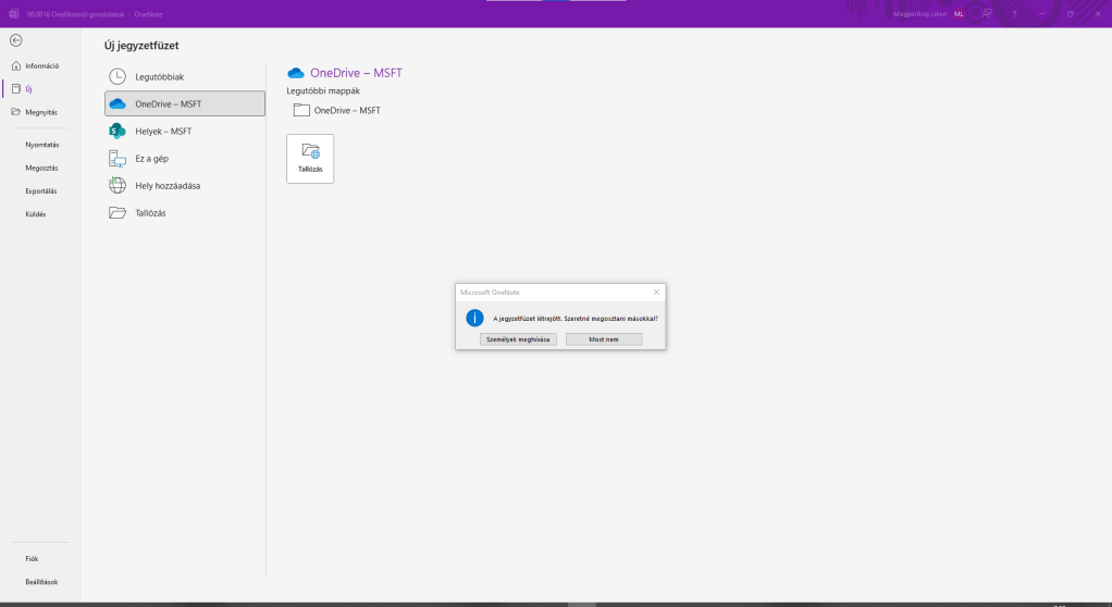 Ha visszamegyünk a PC-s OneNote felületére, akkor az Fájl -> Információ menüben megtaláljuk az új jegyzetfüzetet és azt, hogy kivel lett megosztva.