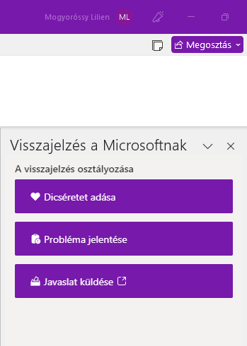 Végezetül pedig egy kis érdekesség a Microsoft részéről. Ha a jobb felső hármas jobb oldali elemét választjuk vagy ebben az oldalsávnak a jobb oldalán átkattintunk az alsó ikonra, akkor a Visszajelzés a Microsoftnak felületet kapjuk.