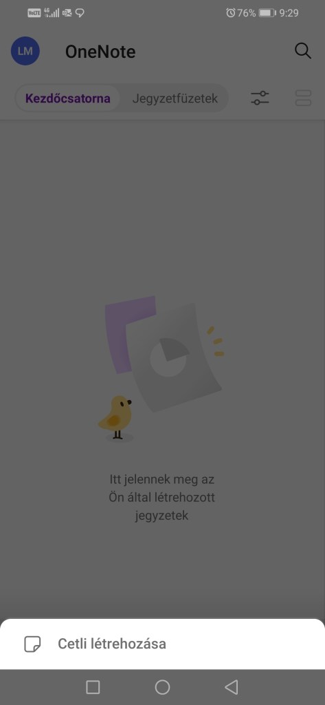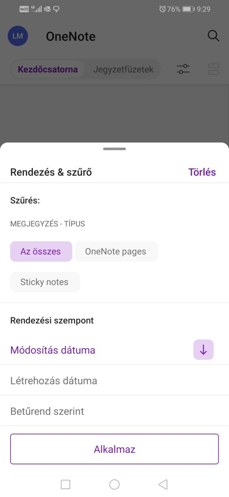 Itt rendezhetjük, illetve szűrhetjük a jegyzeteinket és cetlieinket. Utóbbiakat a kezdőképernyő jobb alsó sarkában található három függőleges pont megnyomására előugró menüben hozhatjuk létre.