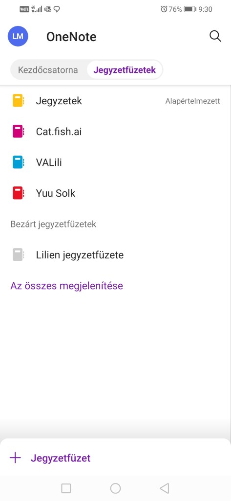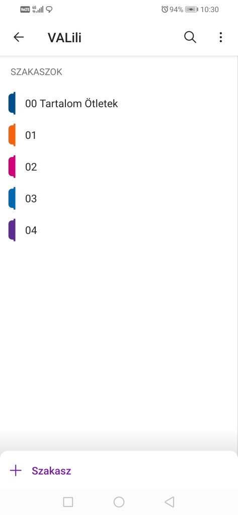 A felső sorban láthatjuk a Kezdőcsatorna és a Jegyzetfüzet közti váltási lehetőséget. Ha utóbbira nyomunk, akkor a PC-s verzió bal sávjára igencsak hasonlító felület fogad minket. Először a Jegyzetfüzetek, majd a Szakaszok, a Lapok, végül a munkafelület.