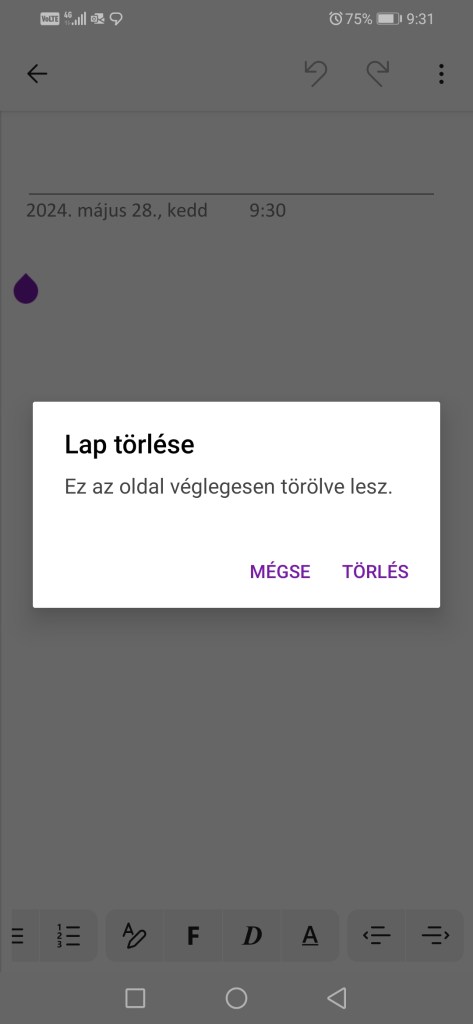 A Törlésre nyomva nem meglepő módon a lap törlését tehetjük meg. Az app ilyenkor feldob egy kis képernyőt, hogy a szándékunk biztosságáról megbizonyosodjon.
