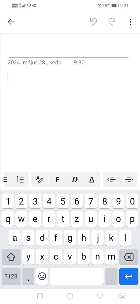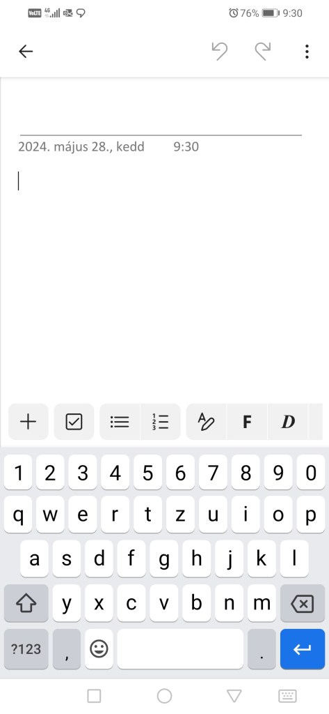 Az alsó sávban találunk még egy fényképezőgép ikont, mely a telefonunk kamerája által rögzített képet szúrja be egy jegyzetbe, illetve mellette a szabadkézi rajzeszközöket, a Rajz fül egyes elemeit találjuk. Végezetül a bal alsó sarokban a „+ Lap” menüben hozhatunk létre új lapot. Ha erre rányomunk, a következő felület fogad minket, a jól megszokott telefonos billentyűzettel és felette egy sávval, mely a szövegekhez tartozó parancsokat és menüket tartalmazza.
