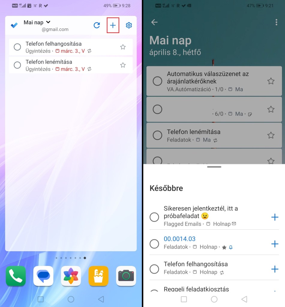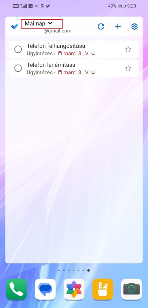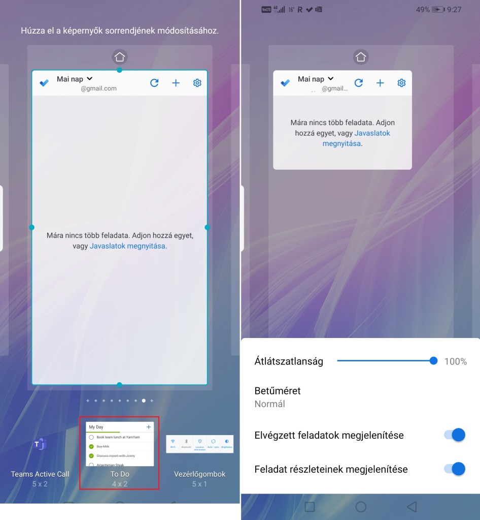 Mikor rányomunk erre, feljön egy menü, amiben az e-mail címüket választhatjuk ki, majd ha ezzel megvagyunk, akkor a minialkalmazás beállításai következnek és az átméretezés. Amint kilépünk a telefon normál nézetébe, az egyik képernyőn ott fog állni az imént beállított minialkalmazásunk. Így nem szükséges csak azért megnyitni az appot, hogy kipipálhassunk feladatokat.