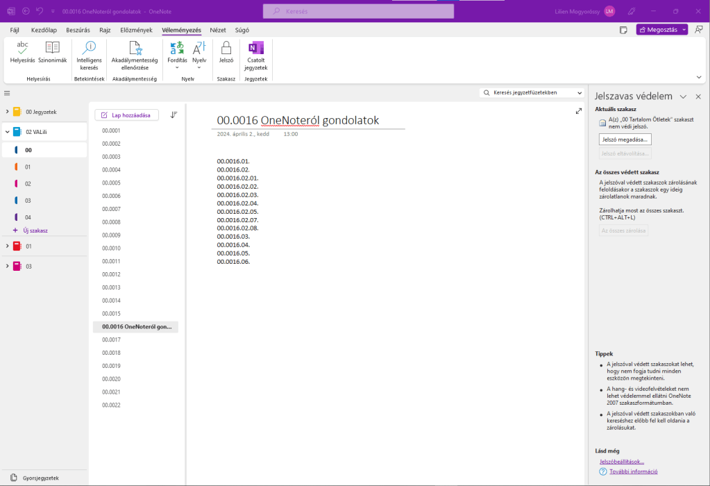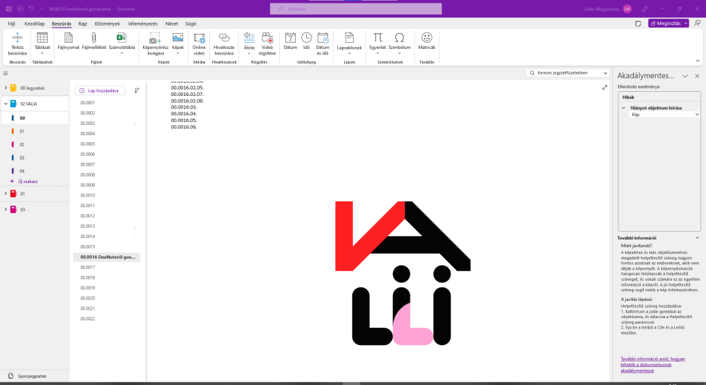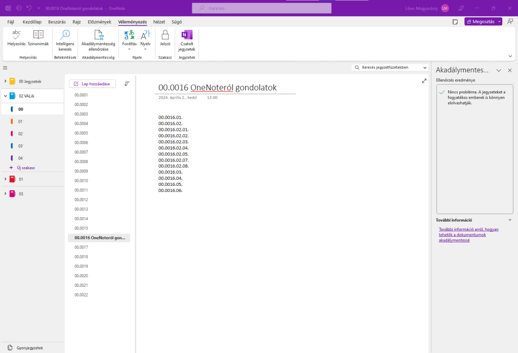 Akadálymentesség. Azt gyakran halljuk a mindennapokban, hogy egy útszakasz akadálymentes, mondjuk van rámpa a lépcső mellett, a mozgássérülteknek, vagy vezetősáv a vakoknak, de hogyan lesz egy program akadálymentes? Nos, a megfejtés nagyon egyszerű; a különböző testi fogyatékkal élők számára is használhatóvá kell válnia. Ilyen akadálymentességi funkció például a szövegek felolvasása, mely a hallásérülteket támogatja. Lényegében az Akadálymentesség ellenőrzése parancs arra szolgál, hogy megtudjuk, vajon a jegyzetünket el tudja-e majd olvasni a vak kolléga, a színtévesztő munkatárs, vagy akárki. Ennek megállapítására egy jobb oldali sávban a program kijelzi, ha minden rendben, és minden akadálymentes, vagy kijelöli a problémás elemeket, melyeket itt felsorolva lehetőséget kínál a javításukra.