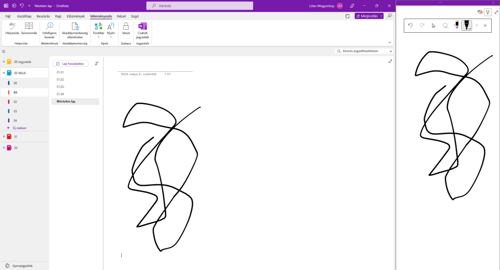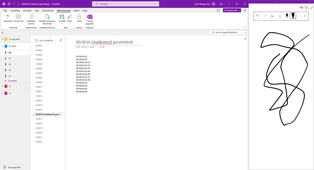 Végül a Csatolt jegyzetek parancs. Ha rányomunk, fel fog dobni egy ablakot, amiben kiválaszthatjuk a programban tárolt egyéb jegyzetfüzeteink, szakaszaink, lapjaink közül, hogy melyikre szeretnénk párhuzamosan jegyzetelni. A kiválasztás után a program ablaka mellé, jobb oldalra egy másik ablak is megnyílik a Rajz fül esetén tárgyalt Teljes képernyős mód-nak megfelelő formában. Ide csak szabadkézi eszközökkel lehet majd jegyzetelni, de mint a korábbi anyagokból kiderül, ebből a későbbiekben könnyedén csinálhatunk nyomtatott betűket, számokat, írásjeleket vagy szimbólumokat.
