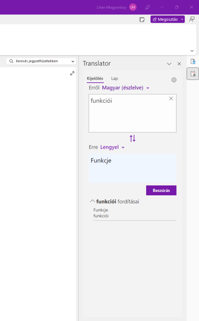 A Nyelv csoport azonos nevű parancsa a program beállításaihoz visz, ahol a nyelvi beállításokat találjuk. Itt megadhatjuk, milyen nyelveken fogunk írni vagy miket akarunk használni. Igazából olyan szempontból nem számít ez, hogy bármit be tudunk írni magyarul akkor is, ha angolra vagy kínaira van állítva a programunk nyelve, de a helyesírás ellenőrző a beállított nyelv helyesírását fogja alapul venni, és nem túl kellemes, ha minden szót pirossal aláhúz, mert nem a magyar nyelv helyesírását veszi alapul. A Fordítás menü „meglepő” módon egy jobb oldali sávot hoz elő, melyben a kijelölt szót vagy szavakat fordíthatjuk le tetszőleges nyelvre. Ennek szemléltetésére én most a „funkciói” szót választottam és lengyelre állítottam.