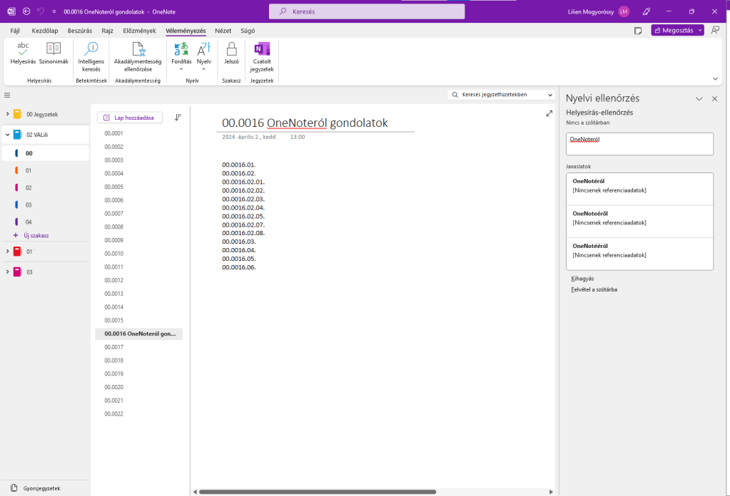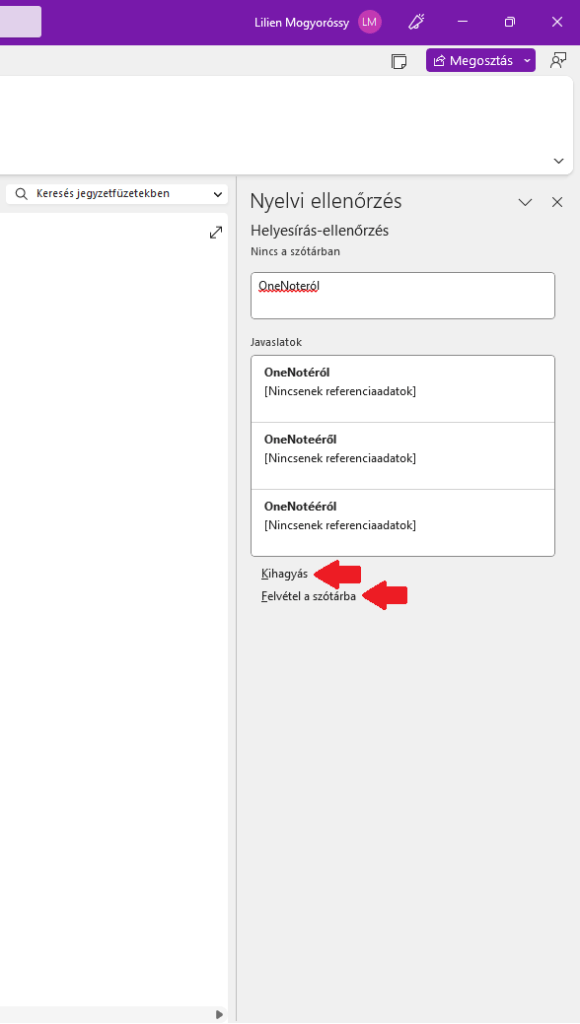 A címben leírt „OneNoteról” szót választottam a helyesírás ellenőrzés alanyának, mivel tudtam, hogy hibásnak ítéli a program. Erre felhívta a figyelmem azzal, hogy pirossal aláhúzta a munkafelület cím mezőjében. Azonban a OneNote egy program neve, melynek magyarul ragozott alakjait nem tartalmazza a helyesírásellenőrző adatbázisa a jelek szerint. Ahogy azt más Microsoft programok esetén megszokhattuk, a helyesírásellenőrző jól működik az esetek döntő többségében, viszont nem tökéletes, nem ismer mindent, főleg, ha az angolhoz képest nagyban eltérő nyelvről lenne szó, mint esetünkben a magyar. Mikor egy hasonló esettel találkozunk, nagyjából három választásunk van. Az első az, hogy ignoráljuk, és nem veszünk tudomást a piros aláhúzásról, a másik kettő lehetőséget pedig a jobb oldali sávban találjuk, a javaslatok alatt. A „kihagyás”-ra nyomva, a helyesírás ellenőrző nem változtat a hibásnak vélt részen, halad tovább a következő hibásnak vélt részre, ha van ilyen. A „Felvétel a szótárba” parancs, a hibásnak vélt részt felveszi a szótárba, ami azt eredményezi, hogy onnét kezdve akármikor írjuk le ugyanilyen formában, többé nem tekinti hibának az adott részt.