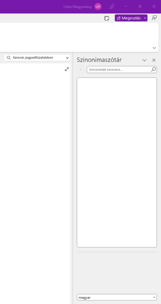 A Szinonimák parancs szintén megnyit egy jobb oldali sávot, melyben a kijelölt szó szinonimáit fogja sorolni a program. Ebből kedvünkre kiválaszthatjuk a nekünk tetszőt, majd alkalmazhatjuk a szövegünkben.